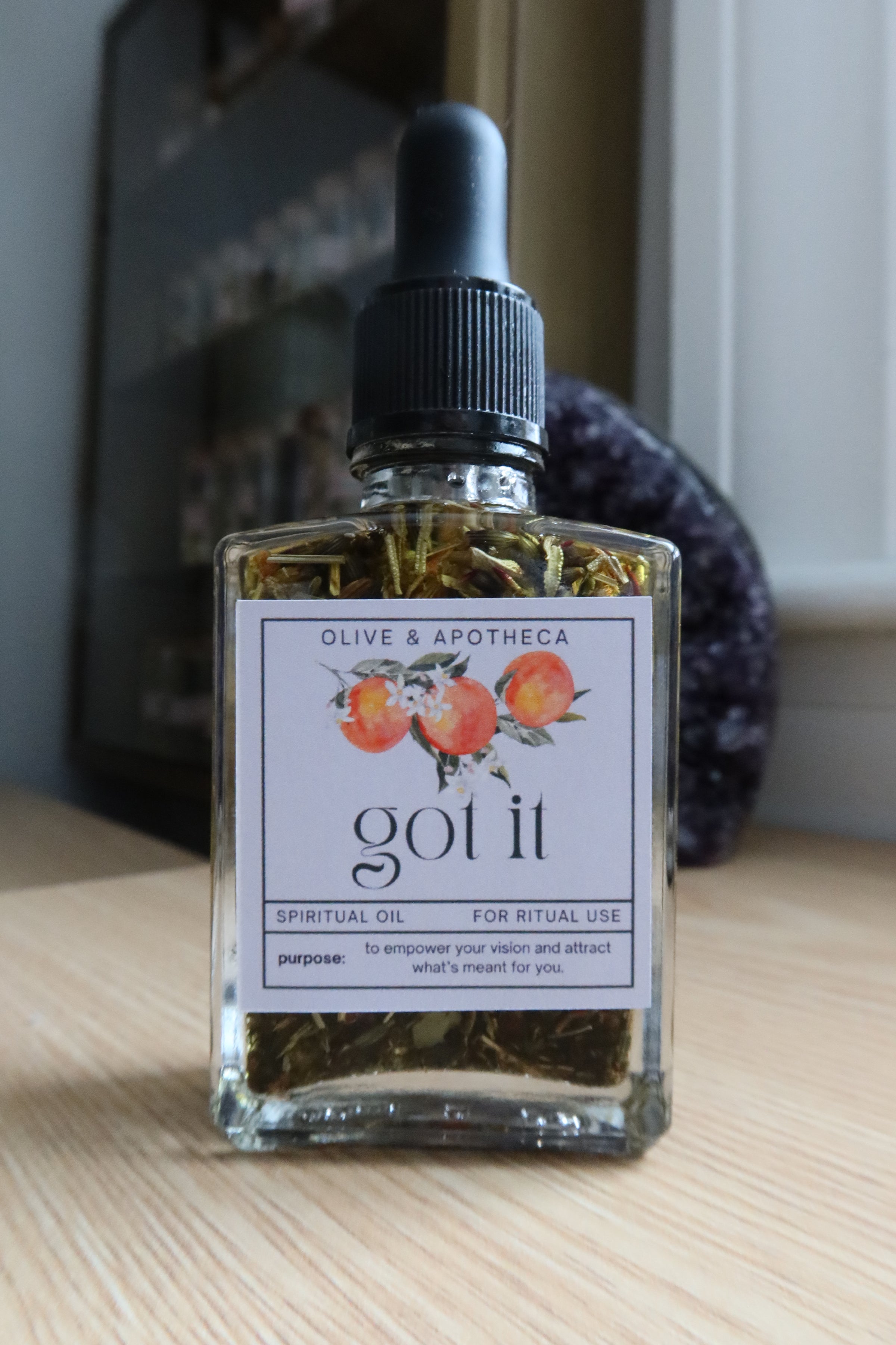 I use got it! oil to anoint candles, spell jars, vision boards, and my ritual tools to amplify my intentions. i dab a drop onto my wrists, hands, or a lucky charm before important meetings, interviews, or moments requiring focus and confidence. whether you’re striving for career advancement, financial prosperity, or personal breakthroughs, my hope is that the
