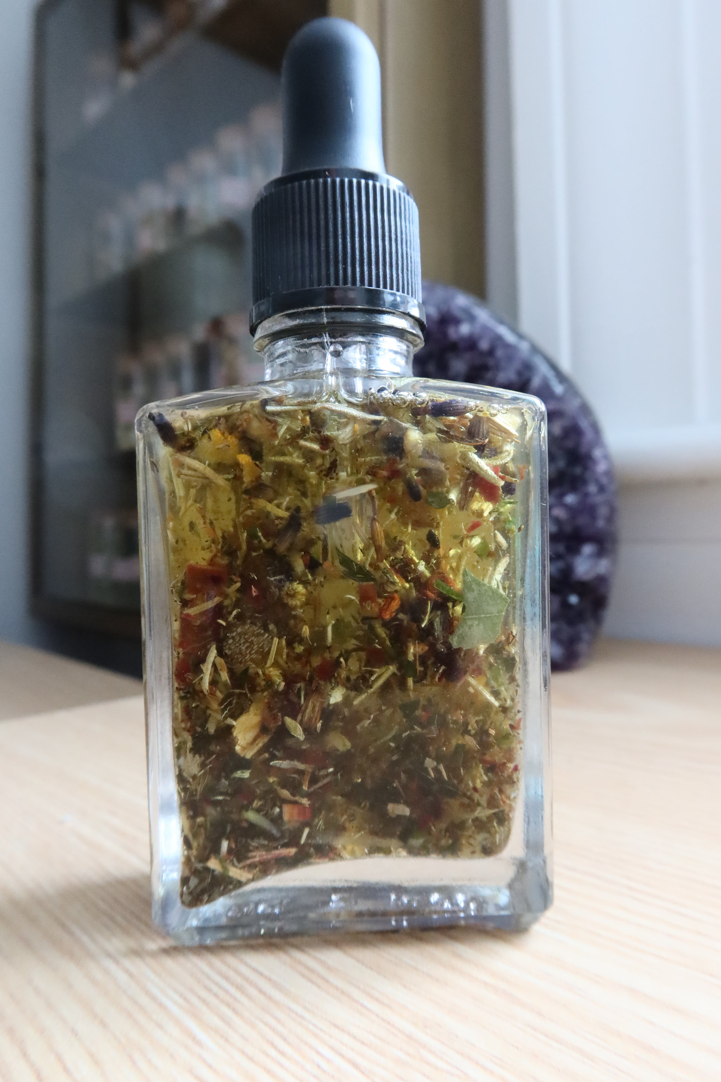 the herbs chosen are intended to, with each use, enhance your magic, strengthen your protection, and align your will with the desired outcome. my hope is that this oil supports the charging and efficacy of your spellwork, by providing you with herbal aids with aligned historical and cultural significance.